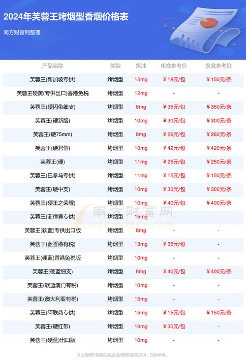 根据市场调查,芙蓉王香烟的价格因地区、销售渠道等因素而有所不同。以下是一些常见的芙蓉王香烟价格概览: