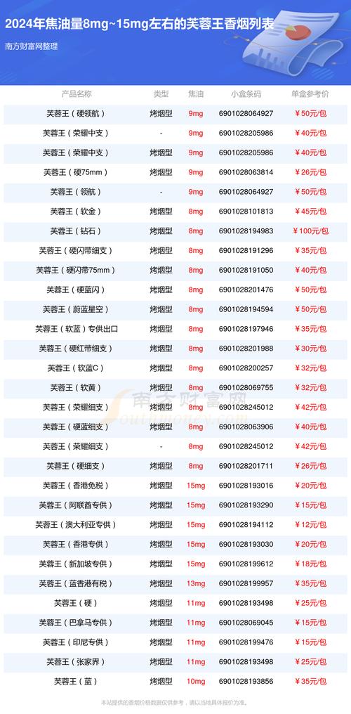 芙蓉王,作为中国烟草行业的知名品牌,自1996年被国家烟草局评为中国最畅销品牌以来,一直深受广大烟民喜爱。芙蓉王香烟以其独特的口感和优雅的包装设计,成为了高端烟草市场的代表之一。本文将从多个维度对芙蓉王所有系列的价格进行详细解析。