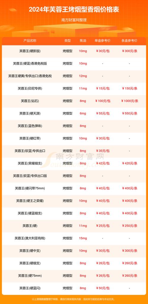芙蓉王,作为中国烟草行业的知名品牌,一直以来都以其独特的口感和品质赢得了消费者的喜爱。今天,我们就来详细了解一下芙蓉王的价格表和产品特点。