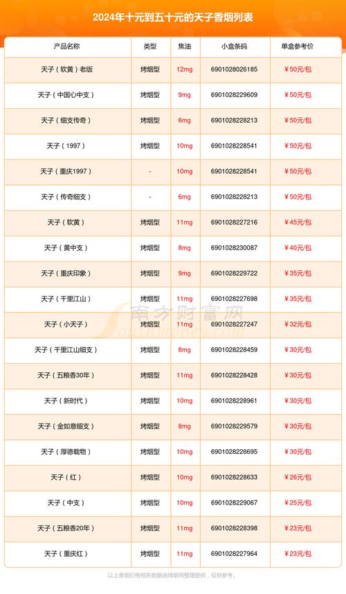 以下为天子香烟部分产品的价格一览表,供您参考:
