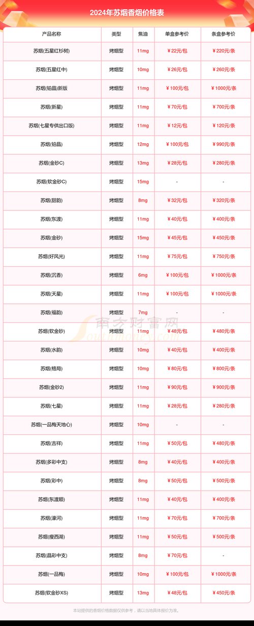 从上表可以看出,苏烟的价格跨度较大,从28元到990元不等。其中,苏烟(铂晶)是苏烟中最贵的,价格为990元一条,而苏烟(金砂c)则是最便宜的,价格为280元一条。