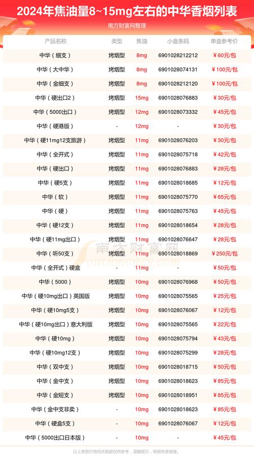 中华烟,作为中国烟草行业的领军品牌,一直以来都以其独特的风味和高品质赢得了消费者的青睐。2023年,中华烟再次推出了多款系列香烟,价格也有所调整。下面,我们就来详细了解一下中华烟的价格表和图片。