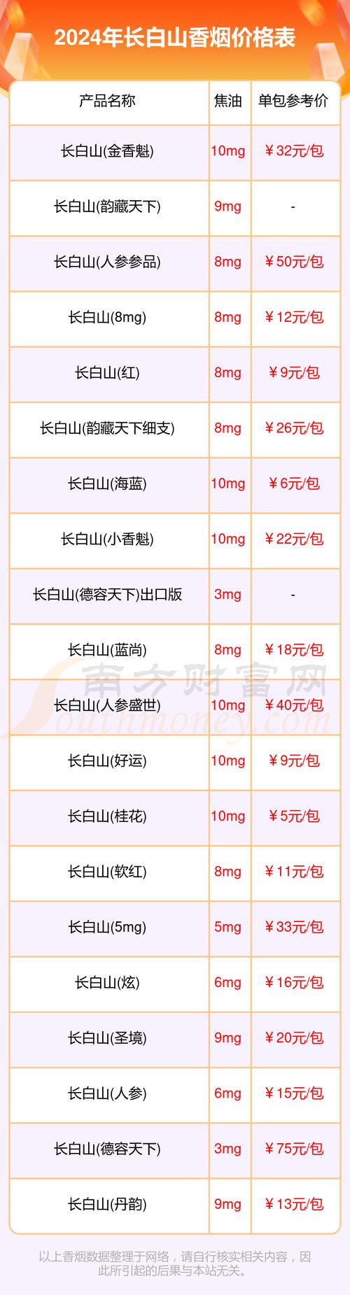 长白山香烟,作为吉林烟草工业有限责任公司的代表品牌,一直以来都深受广大烟民的喜爱。其独特的口感和品质,使得长白山香烟在市场上独树一帜。今天,我们就来详细了解一下长白山香烟的价格表图,以及它的多维度特点。
