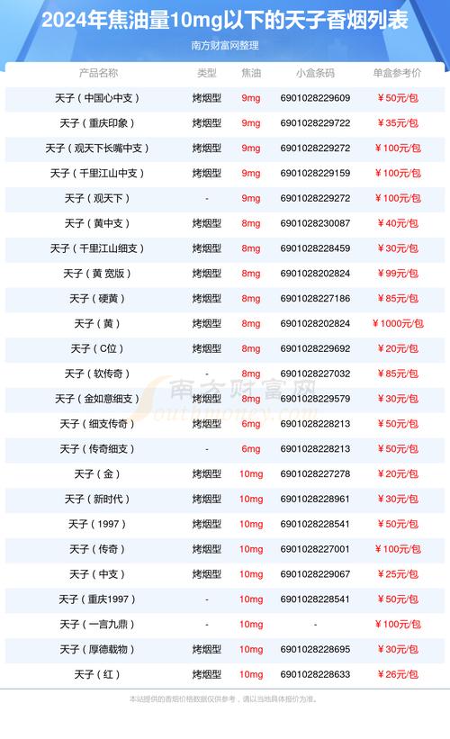 天子香烟,作为中国烟草行业的知名品牌,一直以来都备受消费者喜爱。今天,我们就来详细解析一下天子香烟的价格表图,带您了解这款香烟的多样性和独特魅力。