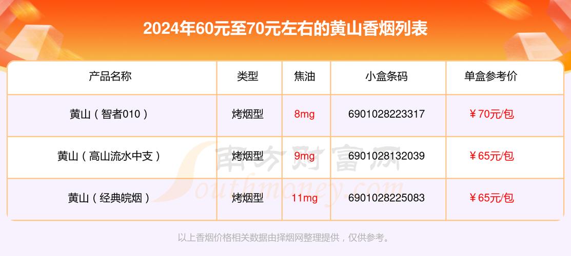 黄山香烟的价格因地区、销售渠道、促销活动等因素而有所不同。以下是一些常见的价格参数: